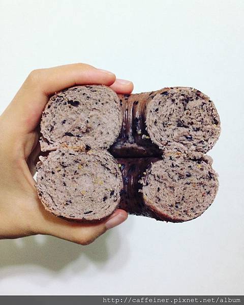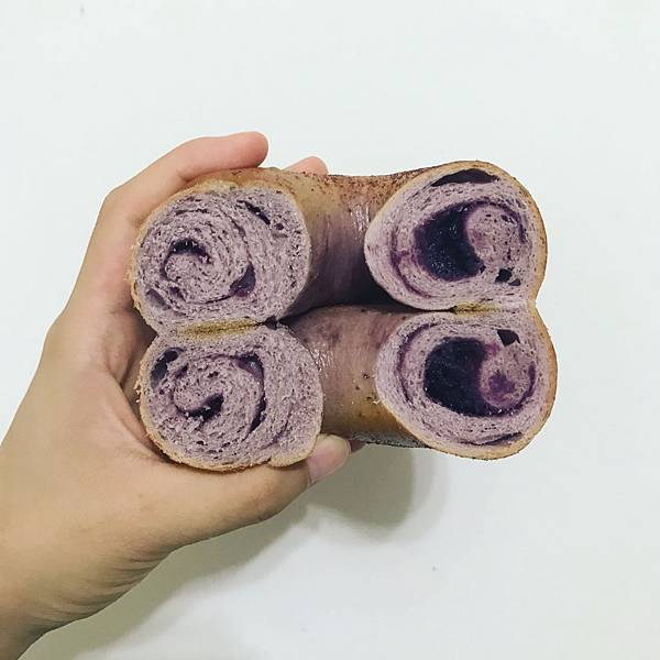 貝果裡包入紫薯泥,餡料滿濕潤的 是有加糖的哦!